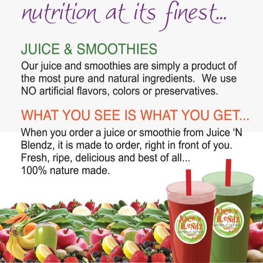 Established in 2012, family owned and operated, Juice 'N Blendz was born out of the love of health. Since opening, Juice 'N Blendz has grown; we acknowledge our customer's loyalty and keep up with our customer's needs. We offer perfect nutrition with many options: raw juices, custom and original smoothies, raw, vegan and gluten free foods, alkalized water, a new custom easy juice cleansing system, a variety of superior food ingredients and nutritional supplements, seasonal soy and gluten free vegan and organic soups, and more.