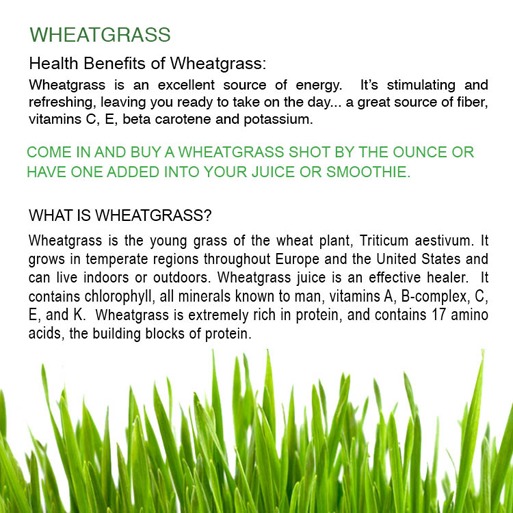 Wheatgrass is an exellent source of energy. Its stimulating and refreshing, living you ready to take on the day... a great source of fiber vitamins C, E bitacarbonate and potassium.