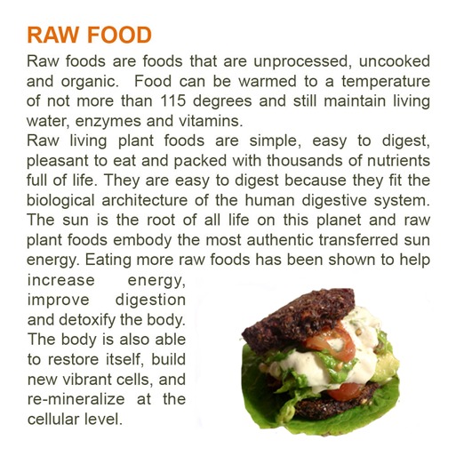 Raw foods are foods that are unprocessed, uncooked and organic. Food can be warmed at temperature of not more than 115 degrees and still maintain living water, enzymes and vitamins.